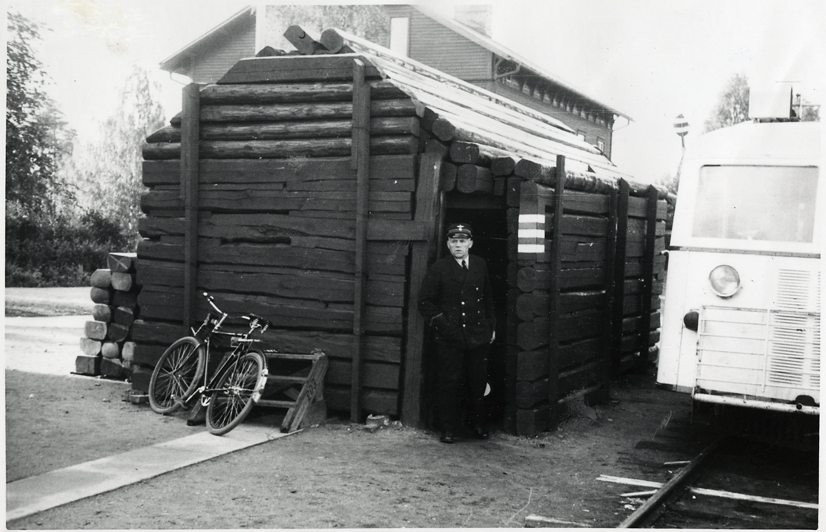 Titel: Föstärkt ställverk vid Jörn Järnvägsstation. Rälsbuss tillverkad av Hilding Carlsson.