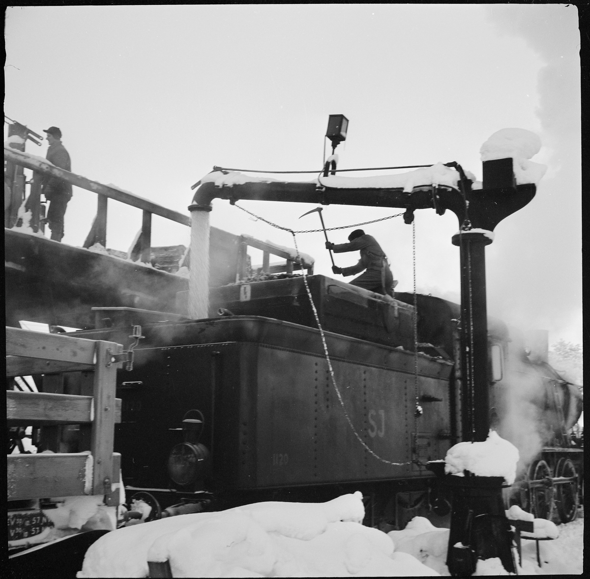 Statens Järnvägar, SJ E2 1120. Påfyllning av kol som vattnas.