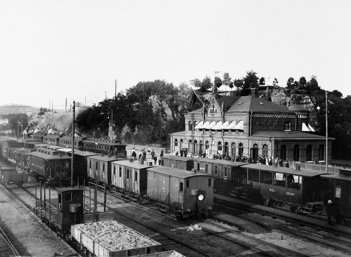 Borås Centralstation, med gods- och personvagnar på bangården.