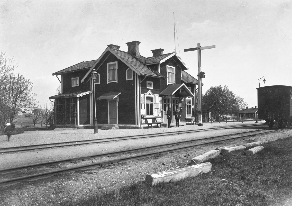 Östra Husby järnvägsstation. Personal framför stationshuset.