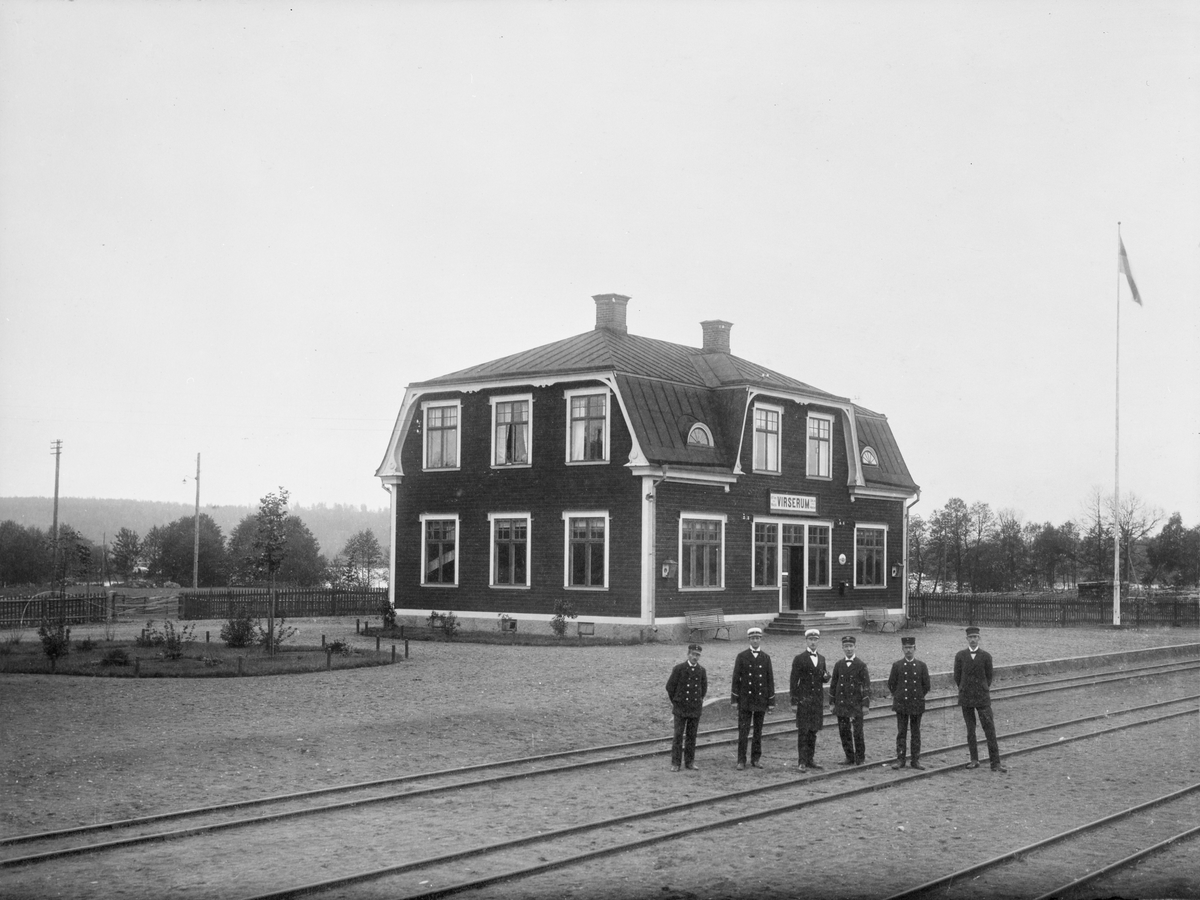 Titel: Stationsinspektor J. Lengqvist med flera poserar vid Virserum station.