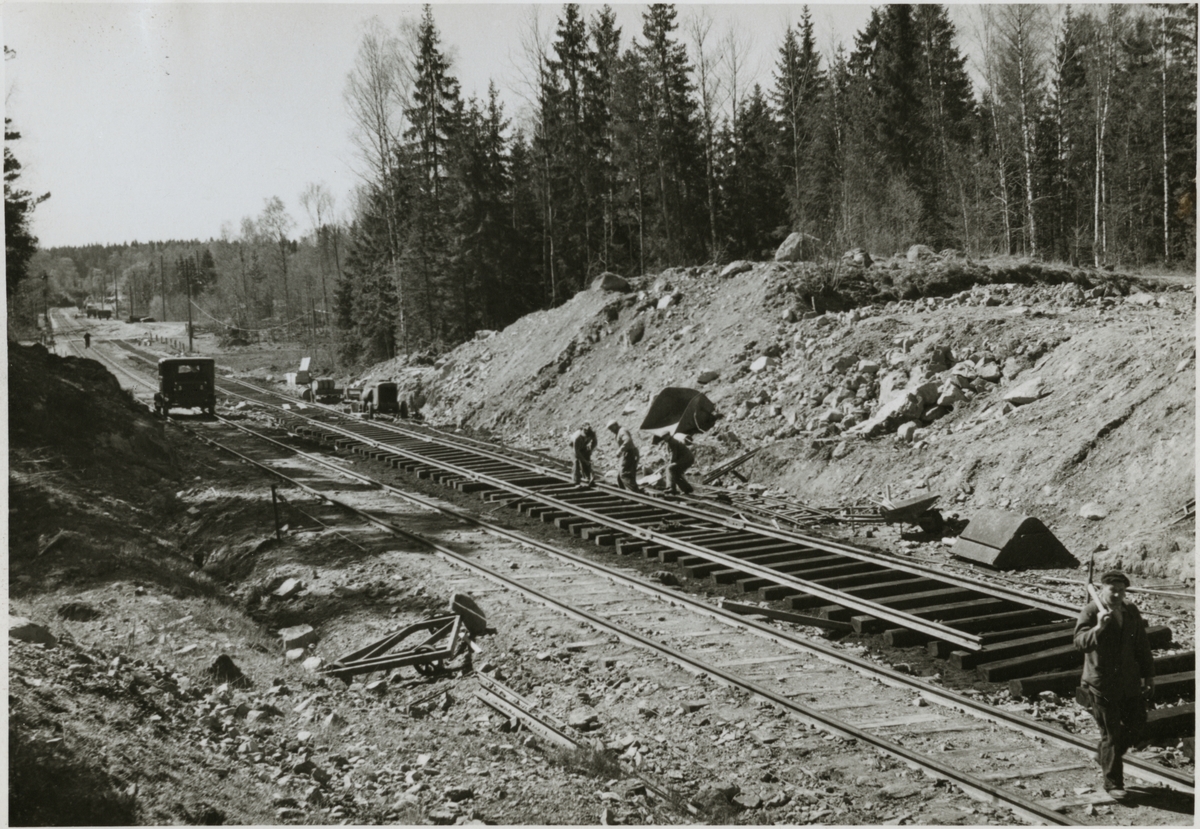 Spårläggning pågår vid en skärning på Trafikaktiebolaget Grängesberg - Oxelösunds Järnvägar, TGOJ:s spår.