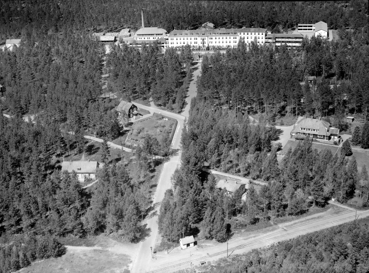 Flygfoto över Målilla sanatorium och hållplatsen med samma namn.