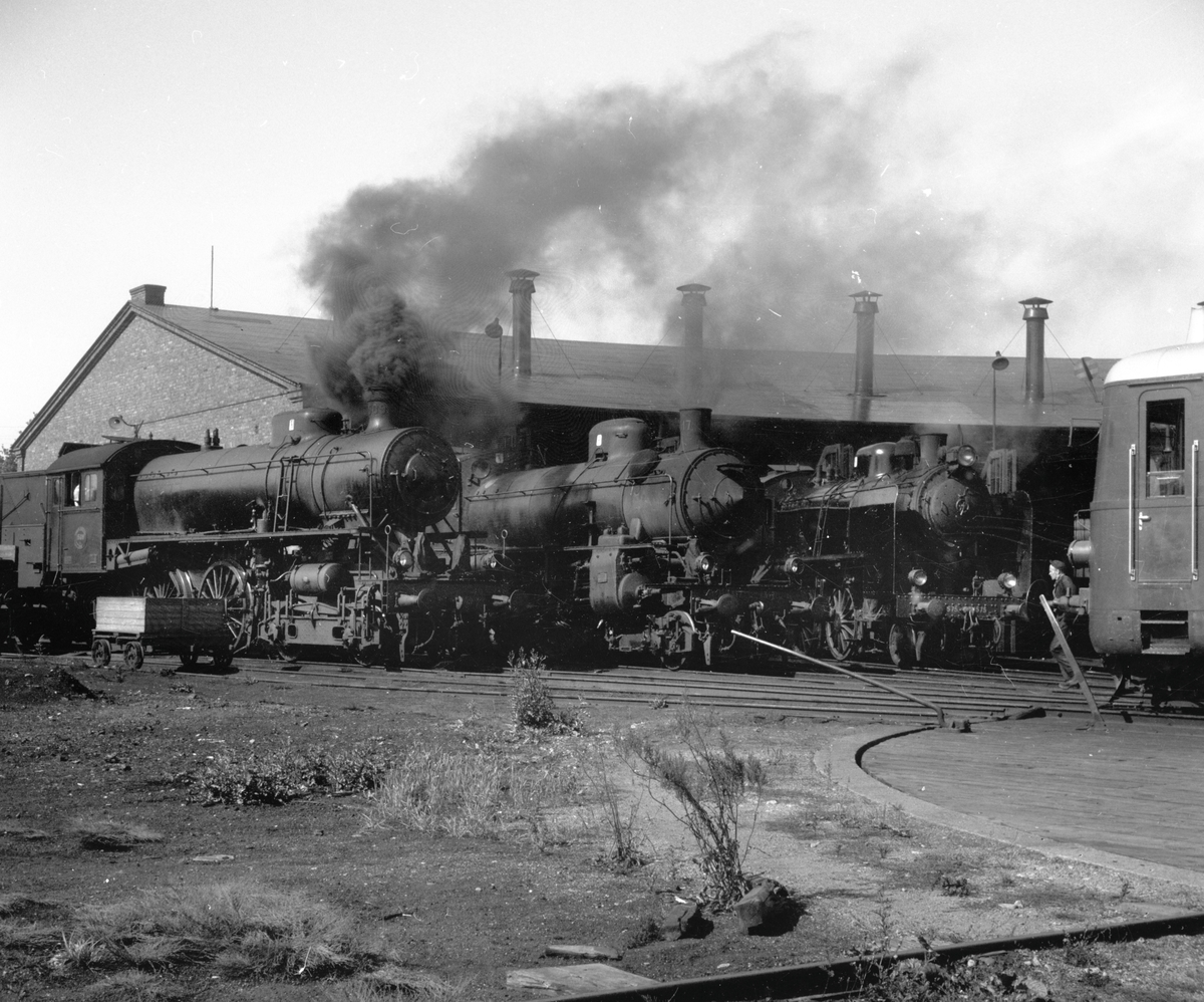 Statens Järnvägar, SJ A3 1509, SJ B 1317 och SJ L5 1575 utanför lokstallet.