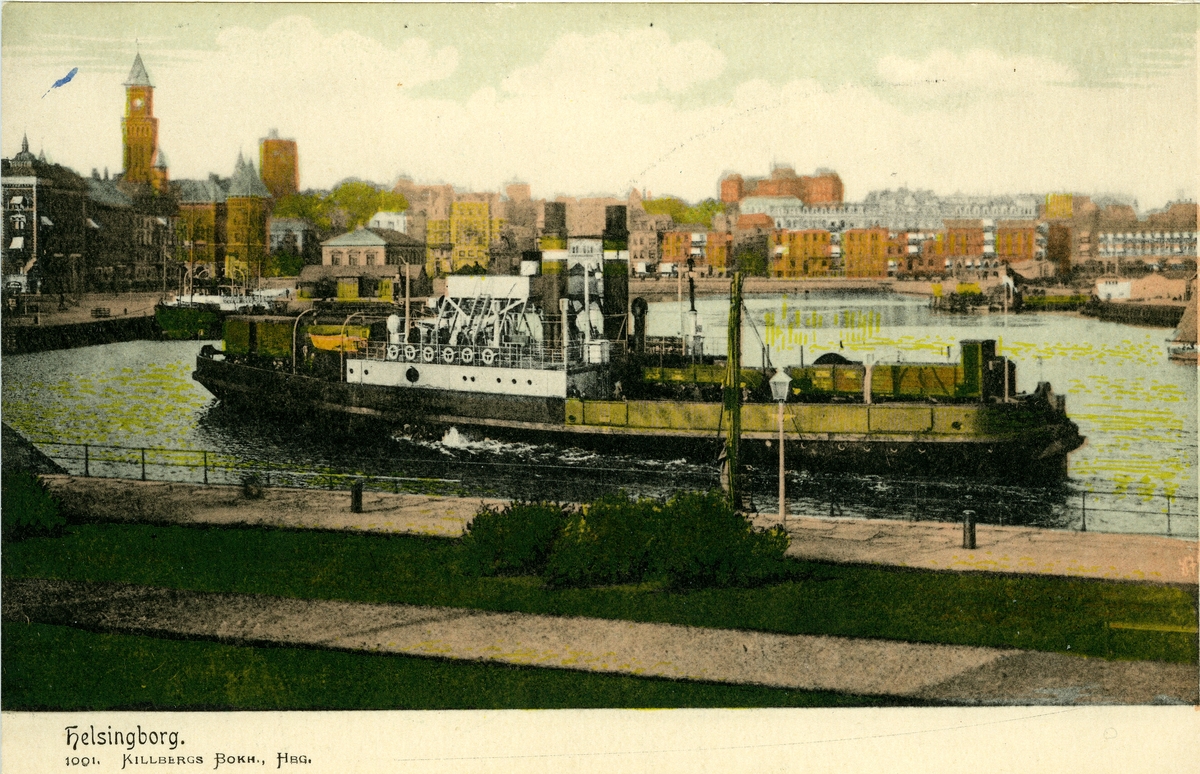 Hamnen i centrala Helsingborg. I bakgrunden till vänster, kan man se byggnaden "Kärnan" i Helsingborgs stadsvy från hamnen