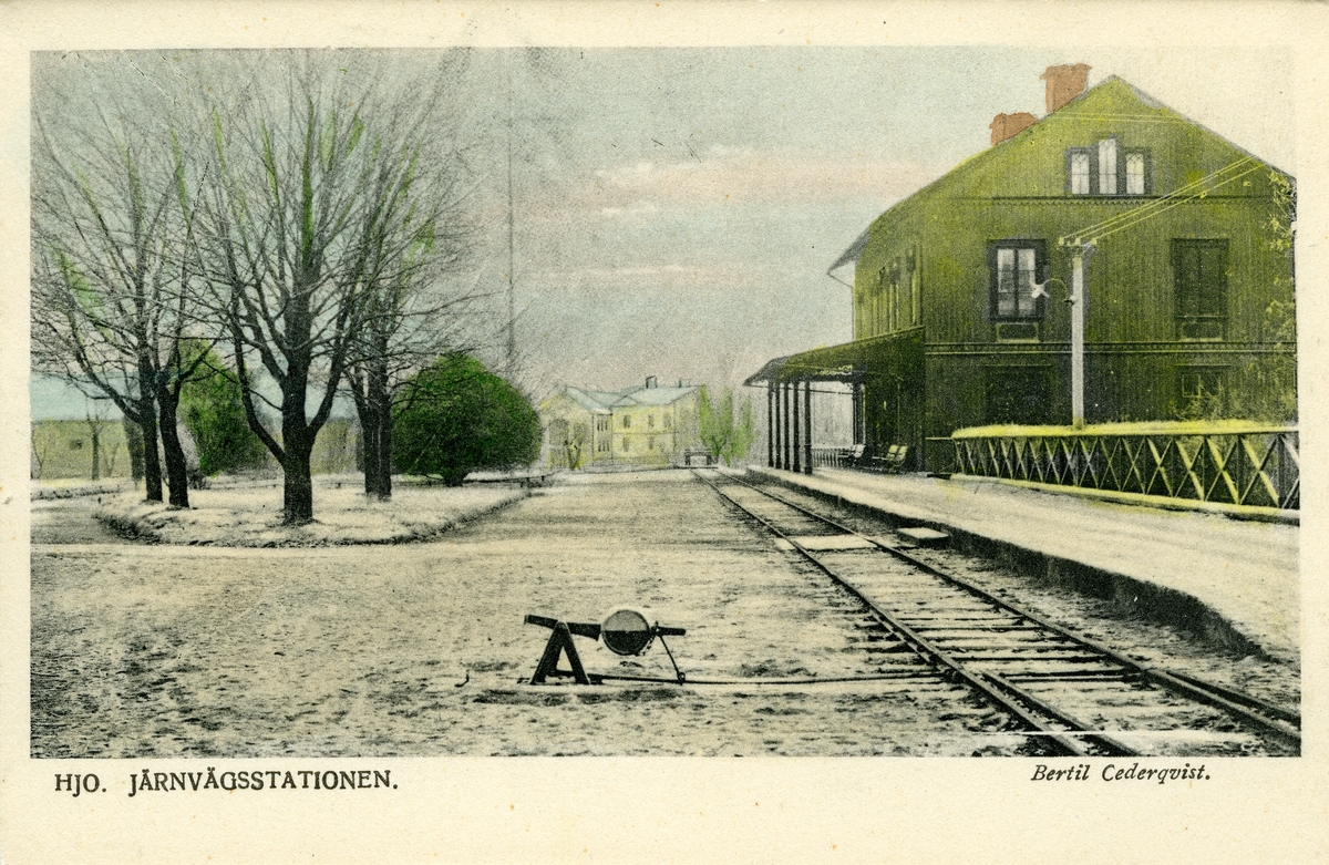 Järnvägsstationen i Hjo. Vid järnvägsspåret mellan Hjo och Stenstorp.