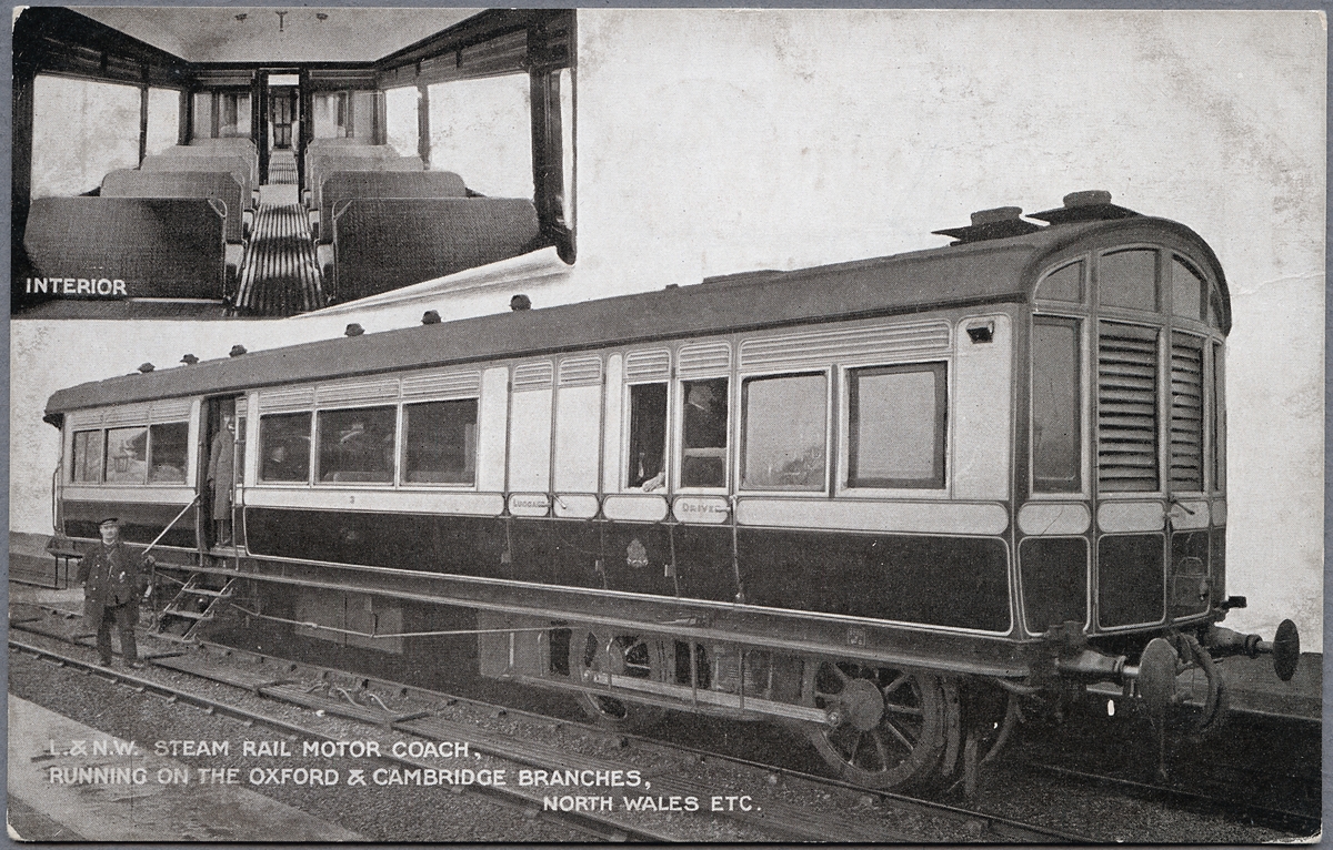 Titel: Ångmotorvagn på linjen Oxford & Cambridge.
