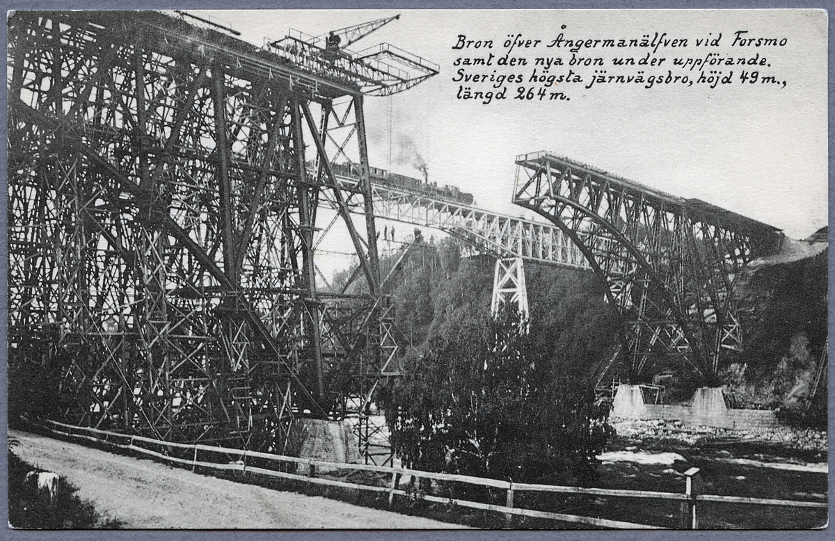 Titel: Ångermanälven vid Forsmo. Gamla bron samt den nya under uppförande.
