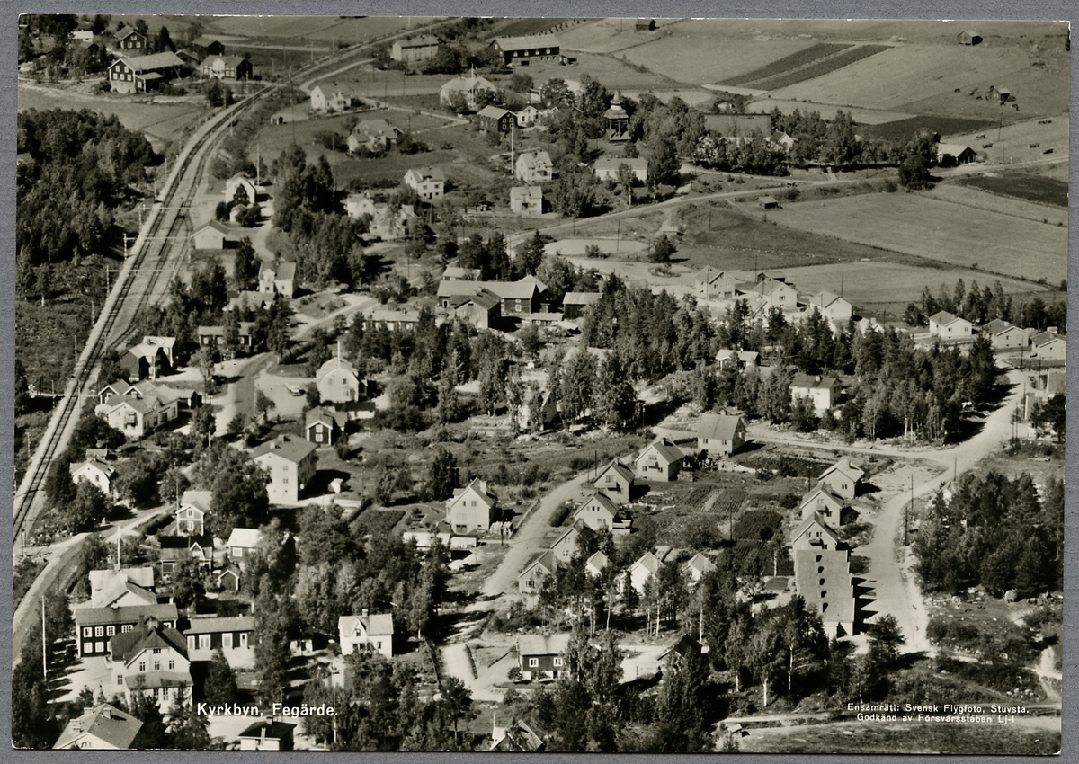 Titel: Flygfoto över Njutånger med stationsområdet till vänster.