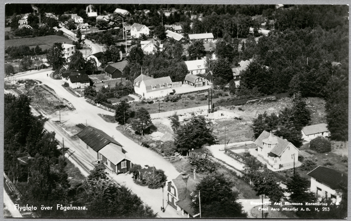 Flygfoto över Fågelmara med stationen i vänster nederkant.