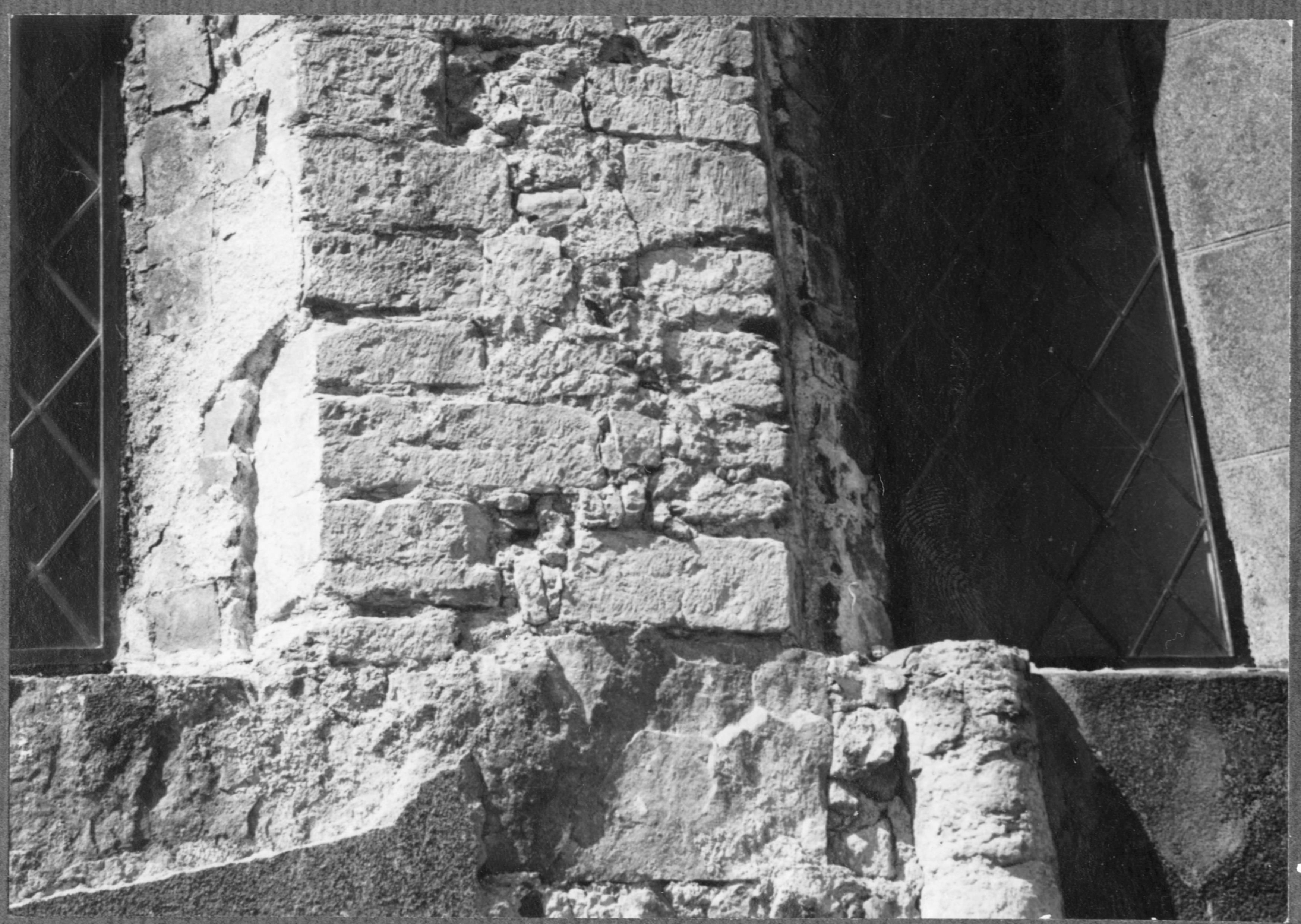 Kyrkan, fasad med fönstersmygarna delvis igensatta med tegelbreckor. Vid nedknackningen av puts.