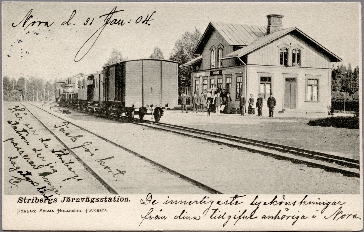 Järnvägsstationen i Striberg. Wikern - Möckelns Järnväg, WMJ.