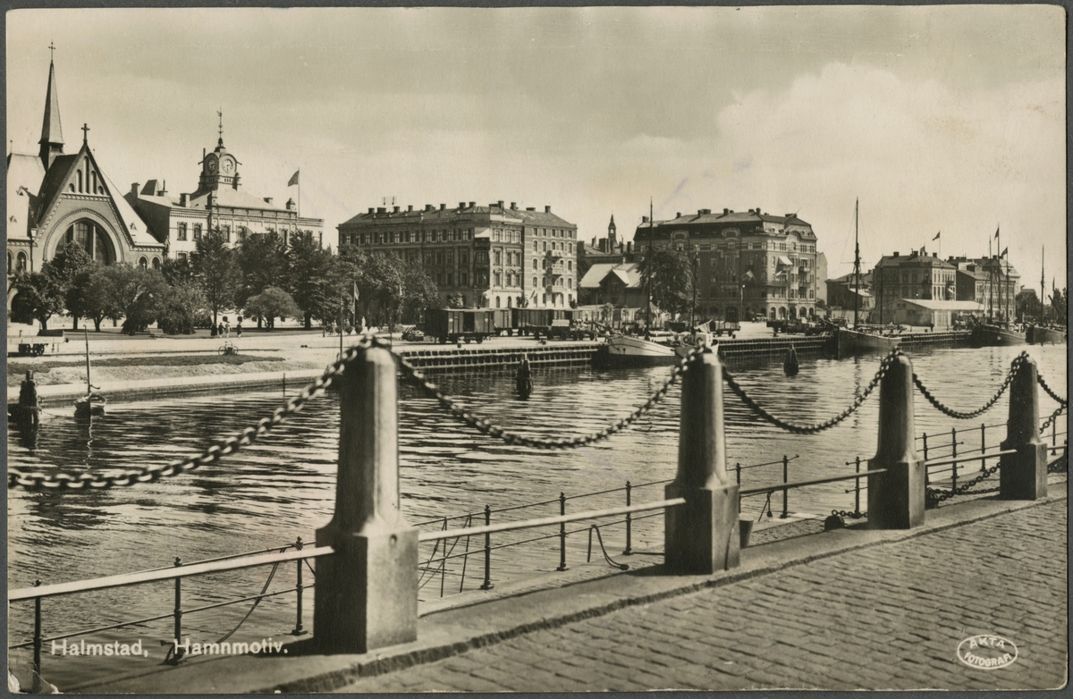 Titel: Vy från hamnen i Halmstad med Immanuelskyrkan.