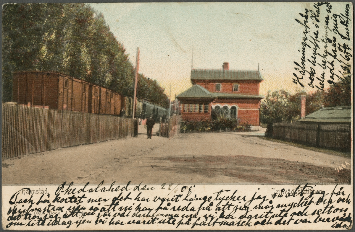 Norra järnvägsstationen i Halmstad på handkolorerat vykort.