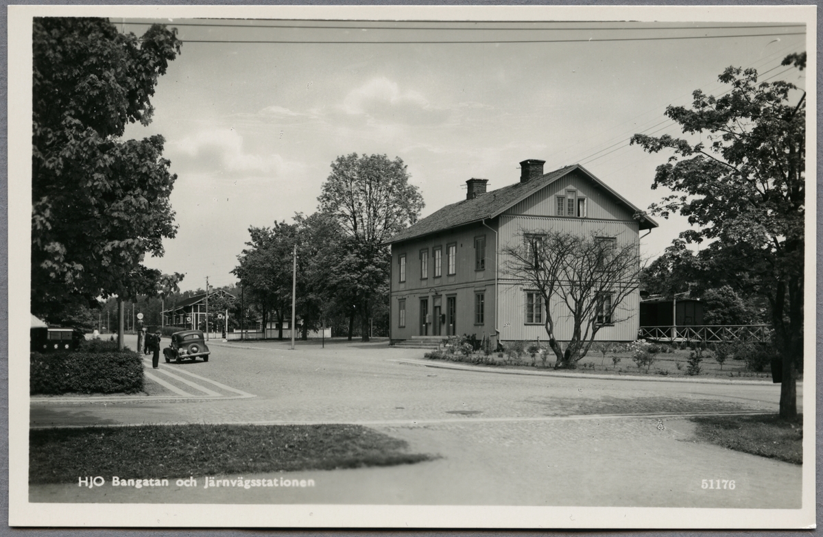 Titel: Järnvägsstationen i Hjo med bensin mack.