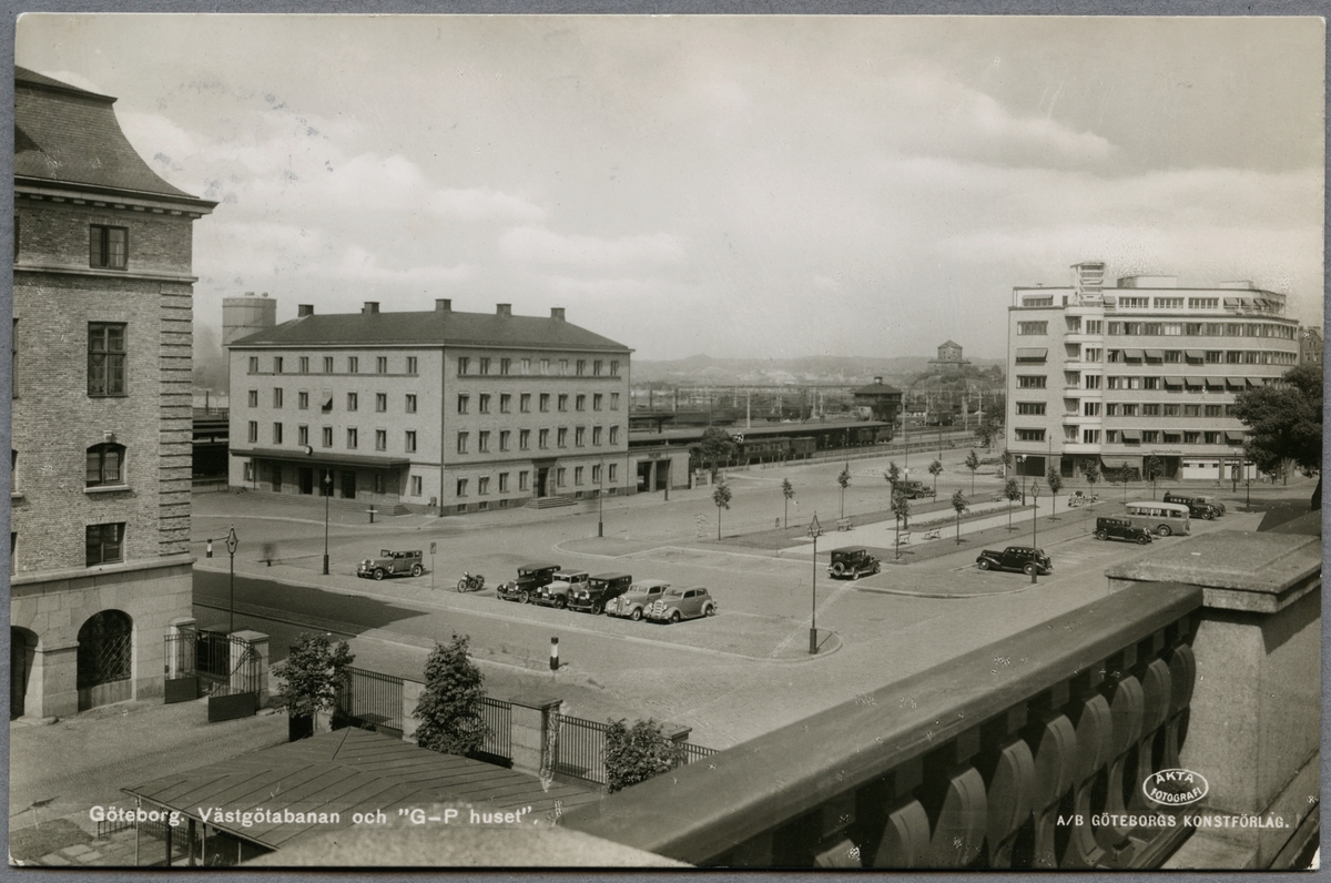 Västgötabanan vid Polhemsplatsen. På fotot syns västgötabanans stationshus och tidningen Göteborgs-Postens hus.