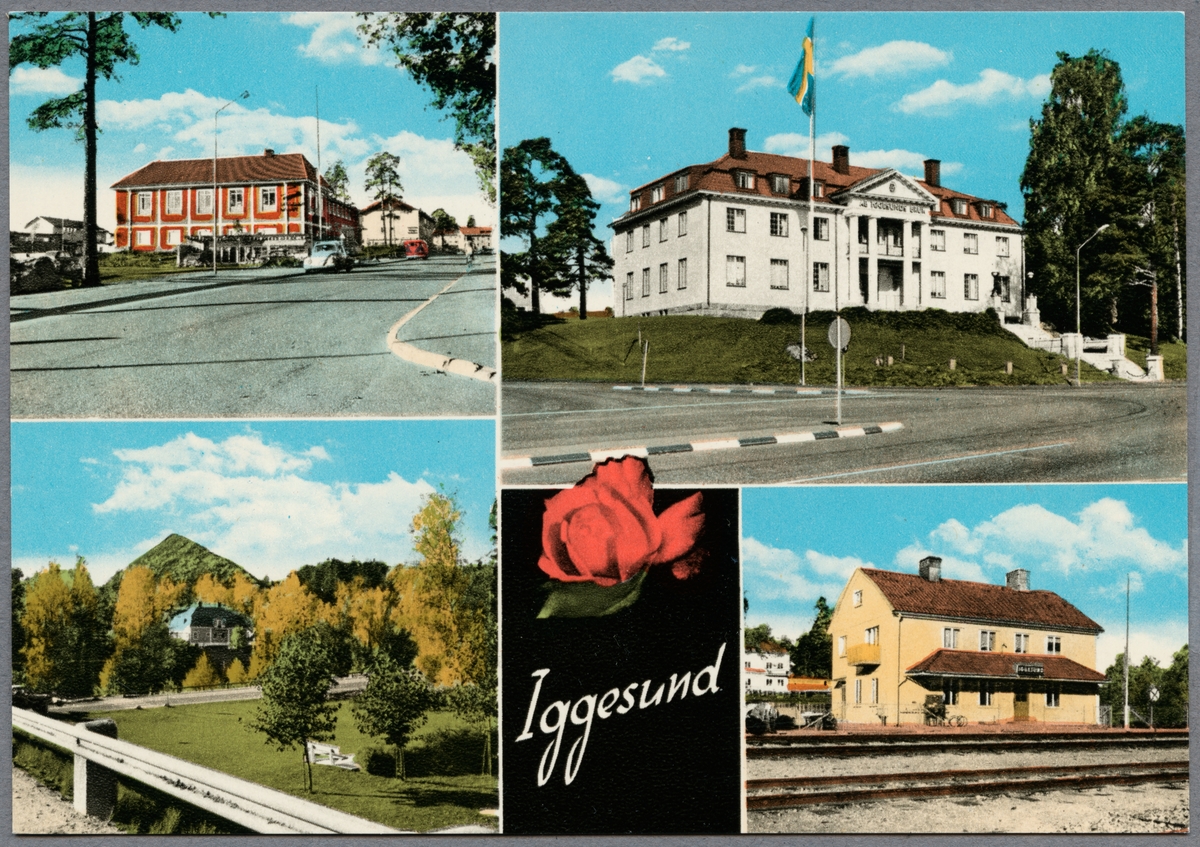 Collage från Iggesund med folkets hus, brukskontor, herrgård och station i bild.