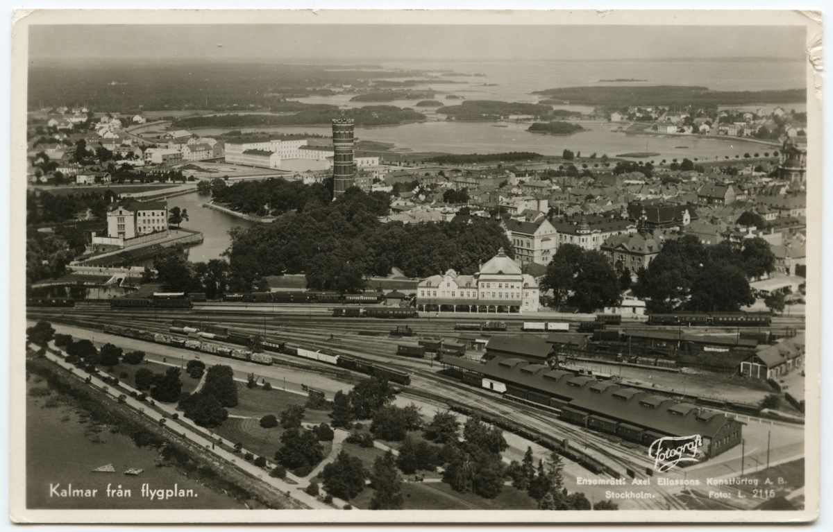 Titel: Vy över Kalmar med Kalmar Central i mitten av bild.