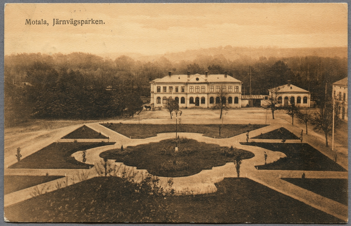 Titel: Gårdssidan av Motala C med park i förgrunden.