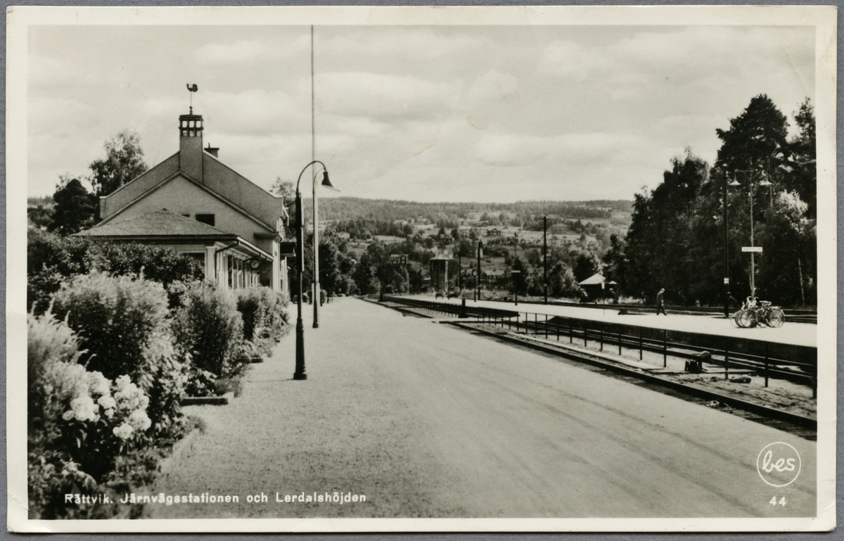 Titel: Rättvik station med vy över Lerdalshöjden i bakgrunden.