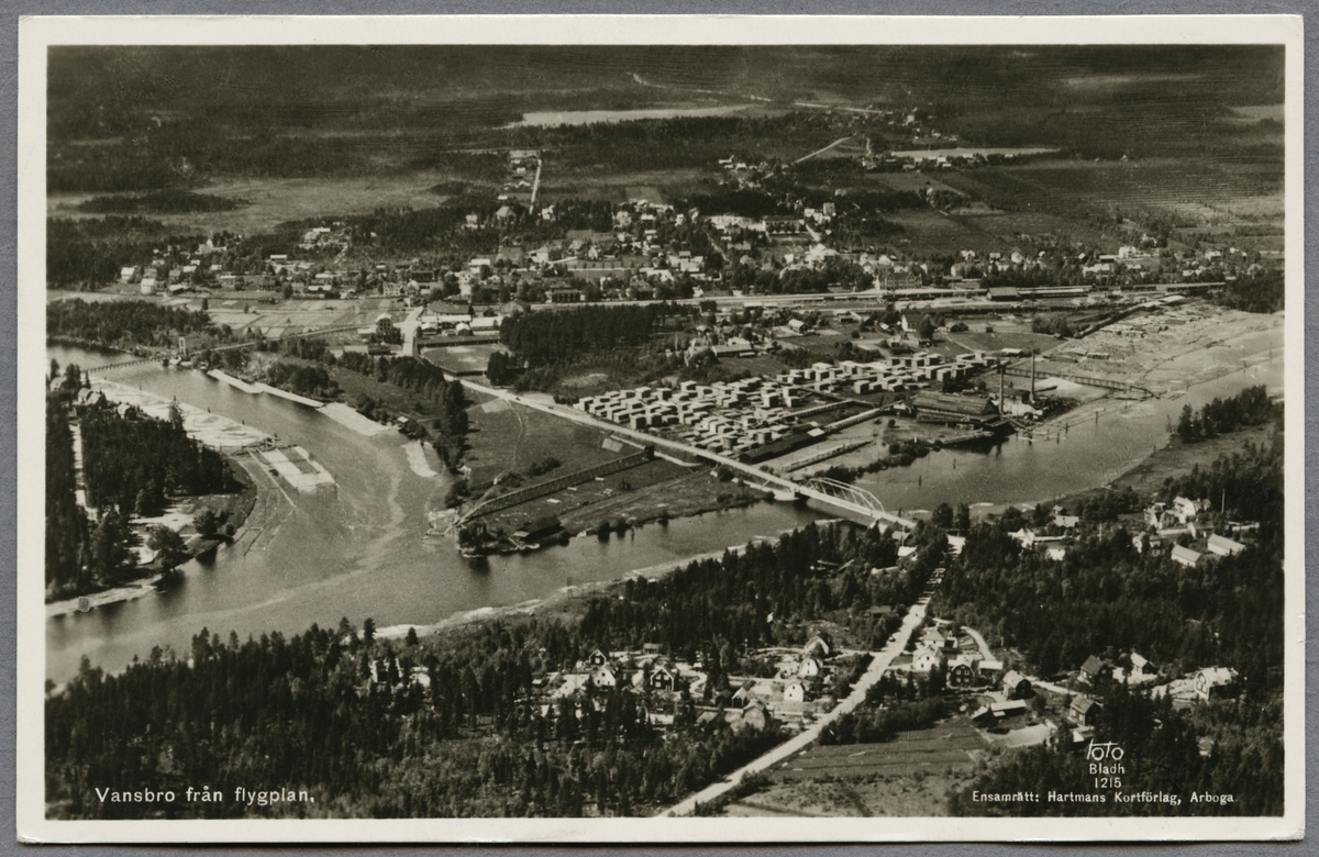 Titel: Flygfoto över Vansbro med Västerdalälven och Vanån i bild.