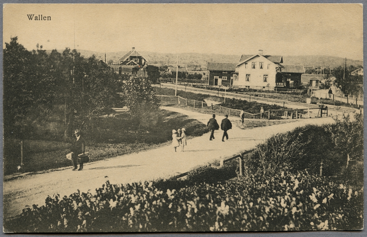 Titel: Väg och resande med persontåg i bakgrunden.