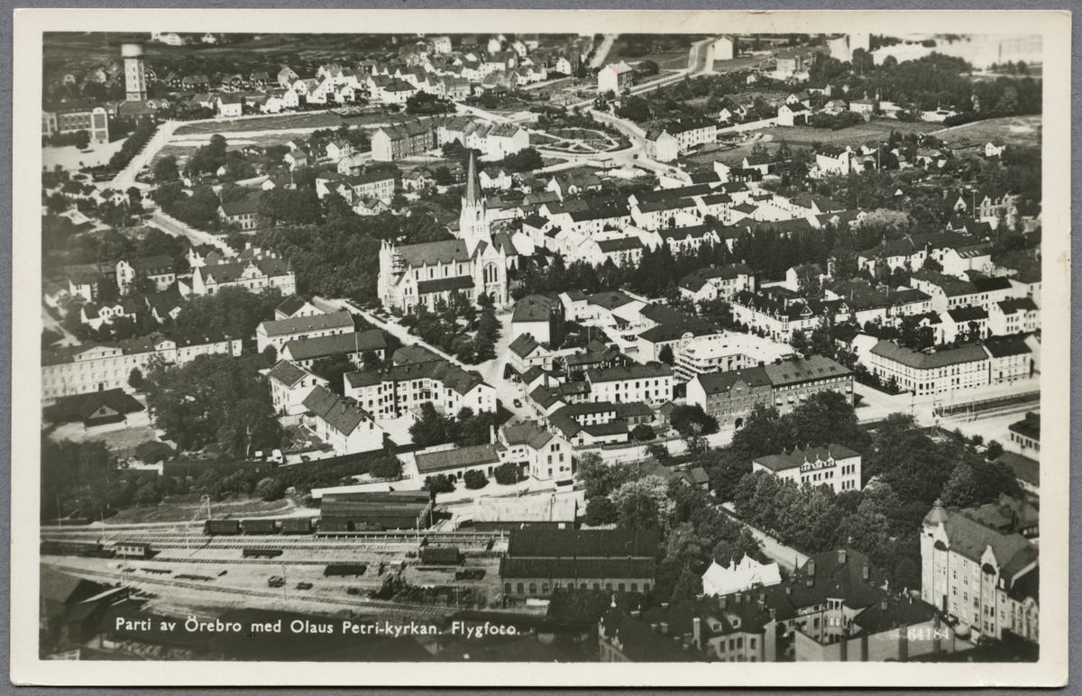Titel: Flygfoto över Örebro med Olaus Petrikyrkan.
