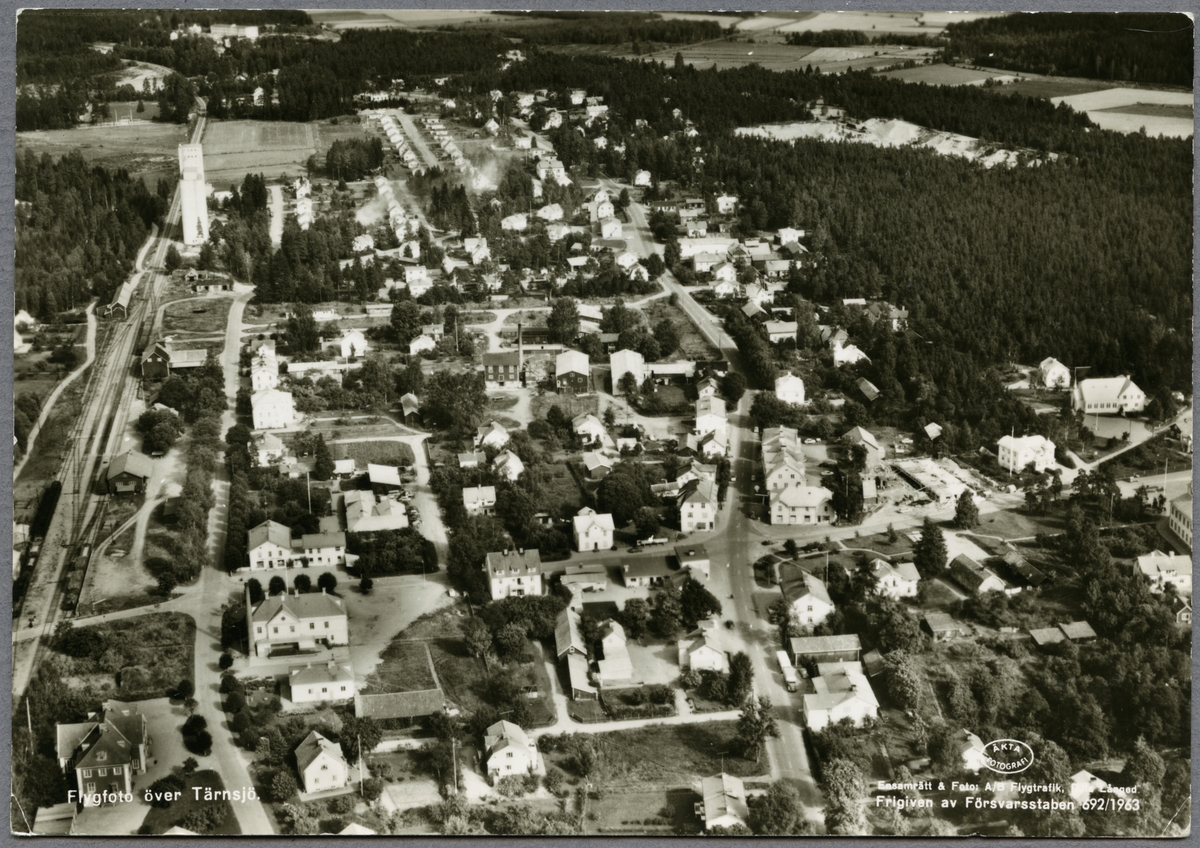 Titel: Flygfoto över Tärnsjö. Stationsområdet syns till vänster i bild.