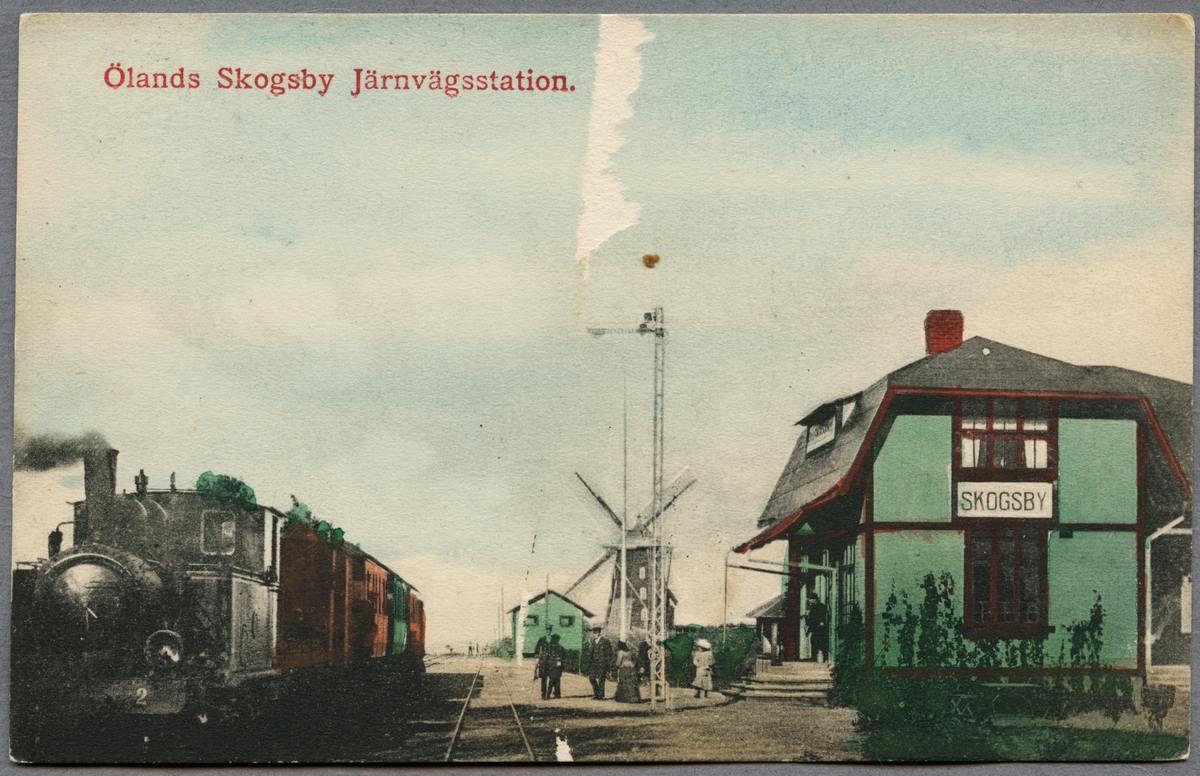 Södra Ölands Järnväg, SÖJ lok 2 inne på Ölands Skogsby Järnvägsstation. I bakgrunden en Väderkvarn.