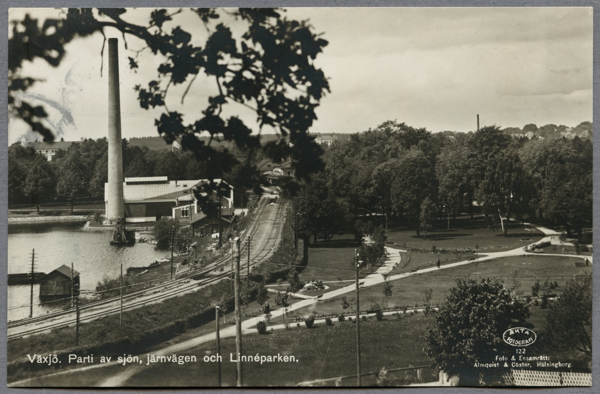 Spår vid Växjösjön med Linnéparken i förgrunden.