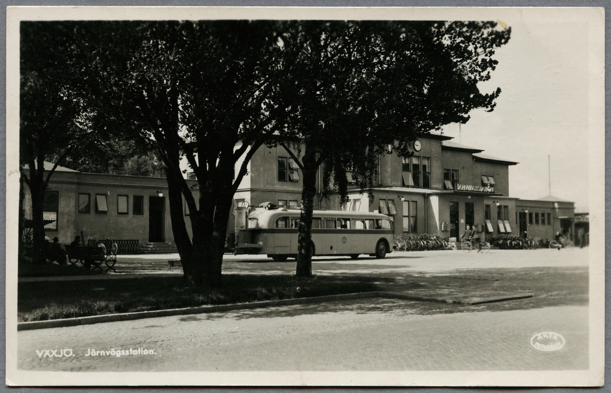 Titel: Station sedd från vägsidan med buss framför.