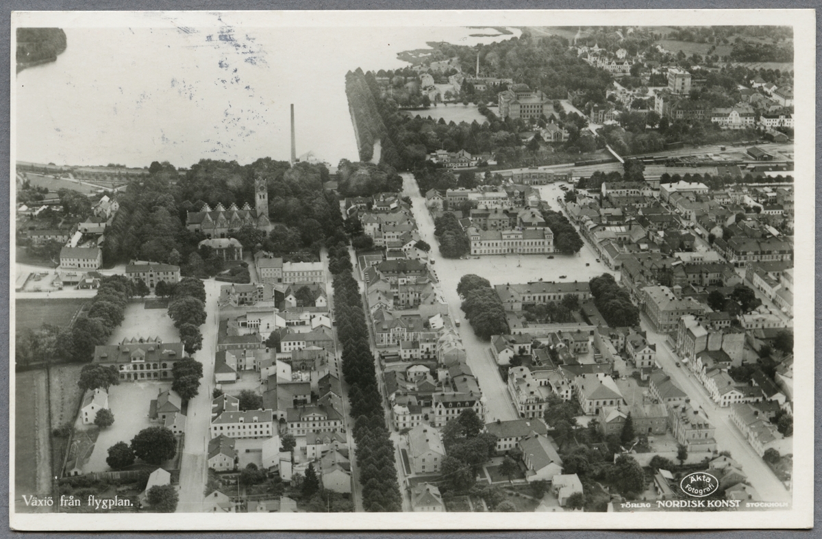 Titel: Flygfoto över Växjö med domkyrka och Växjösjön.