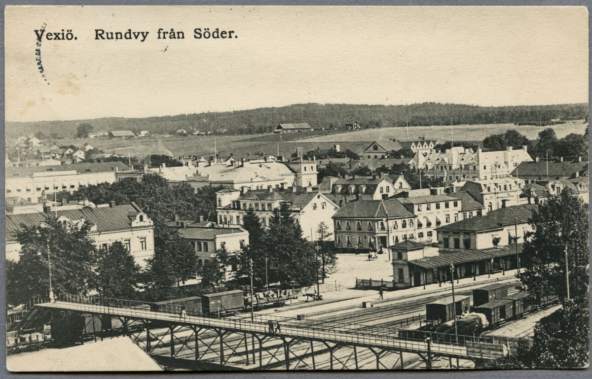 Vy över Växjö med del av station i bild.