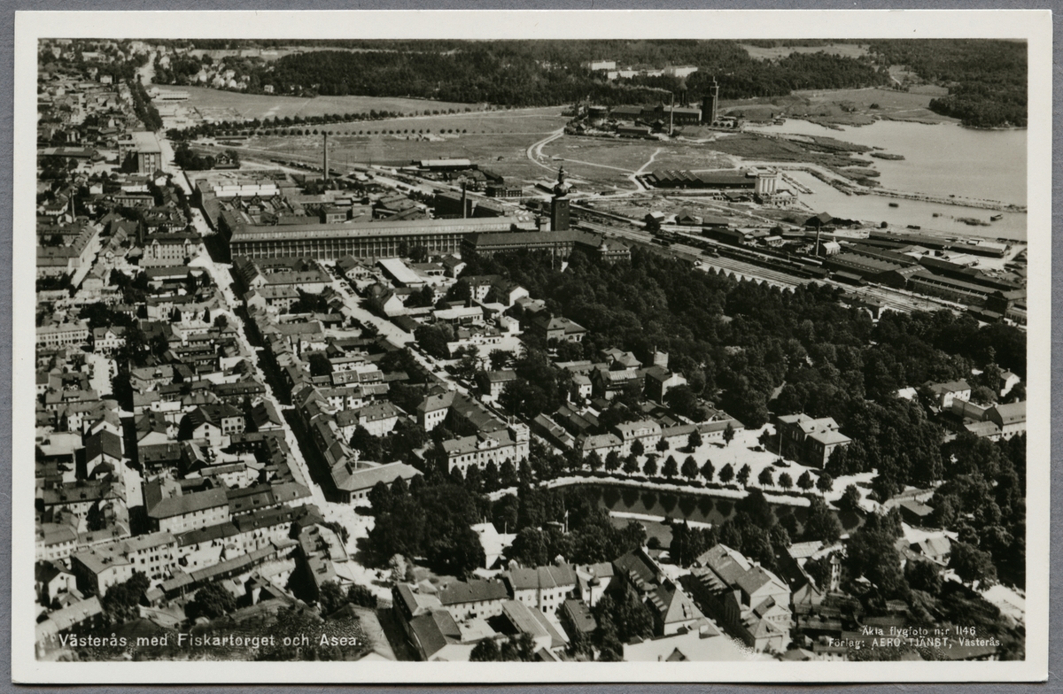 Titel: Flygfoto med vy över Västerås med industriområde i bakgrunden.