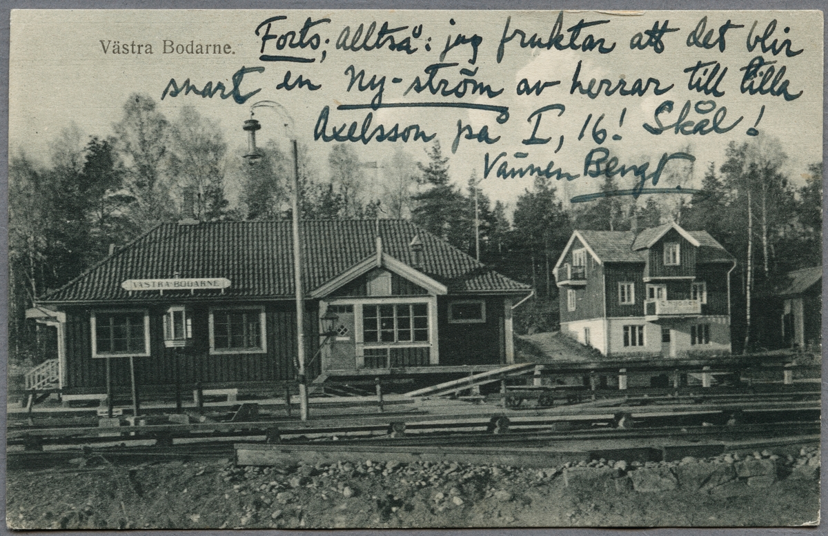 Titel: Station sedd från spårsidan med hus i bakgrunden.