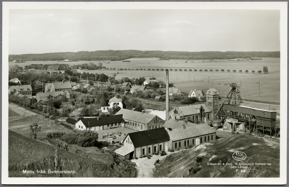 Titel: Vy över Gunnarstorp gruva med järnvägen i bakgrunden.