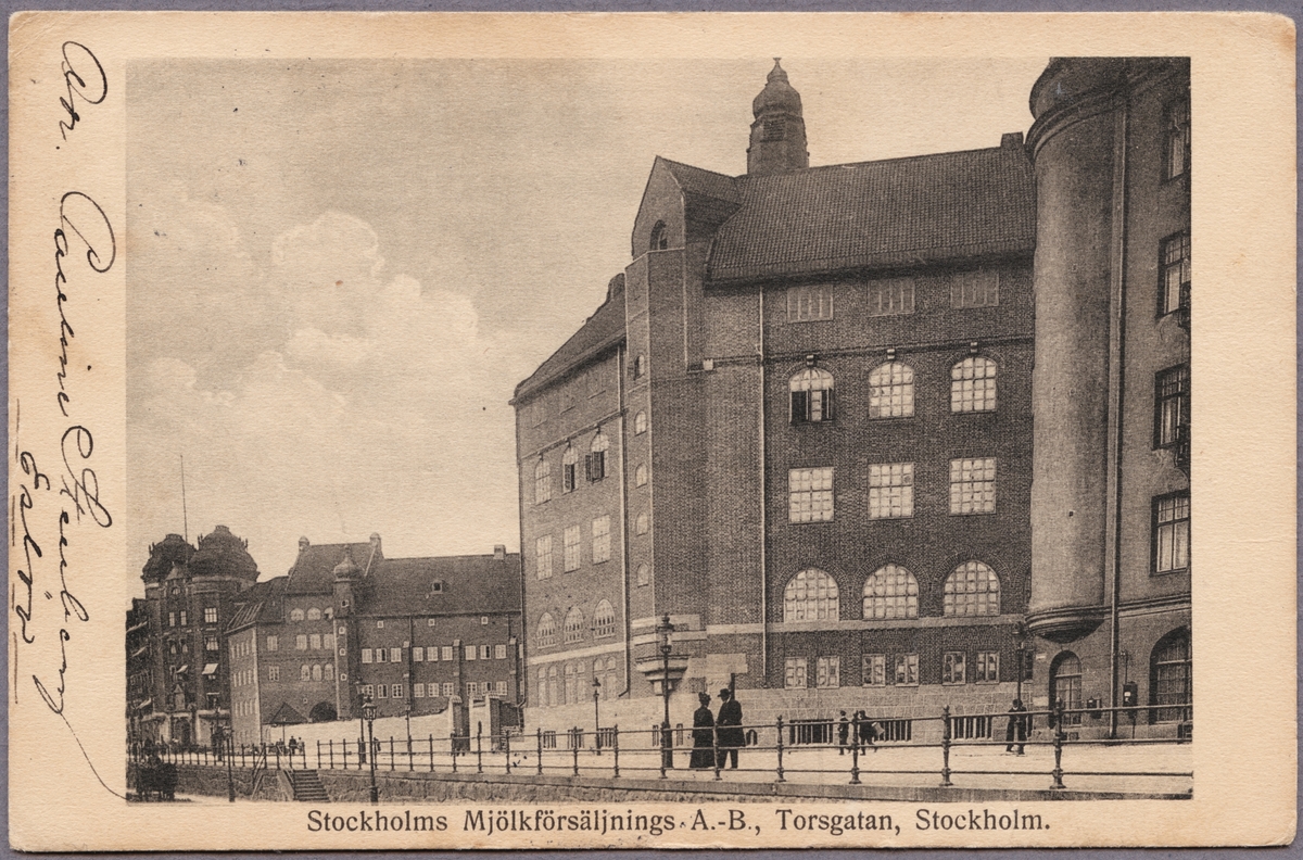 Bild från Torsgatan nära Odenplan i Vasastan, Stockholm. I förgrunden Stockholms Mjölkförsäljnings Aktiebolag.
