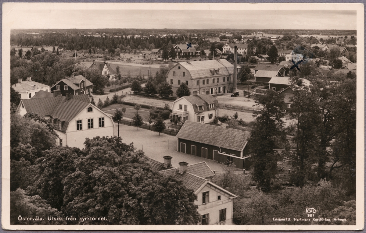 Titel: Vy över Östervåla samhälle med Mejeriet centralt i bilden.