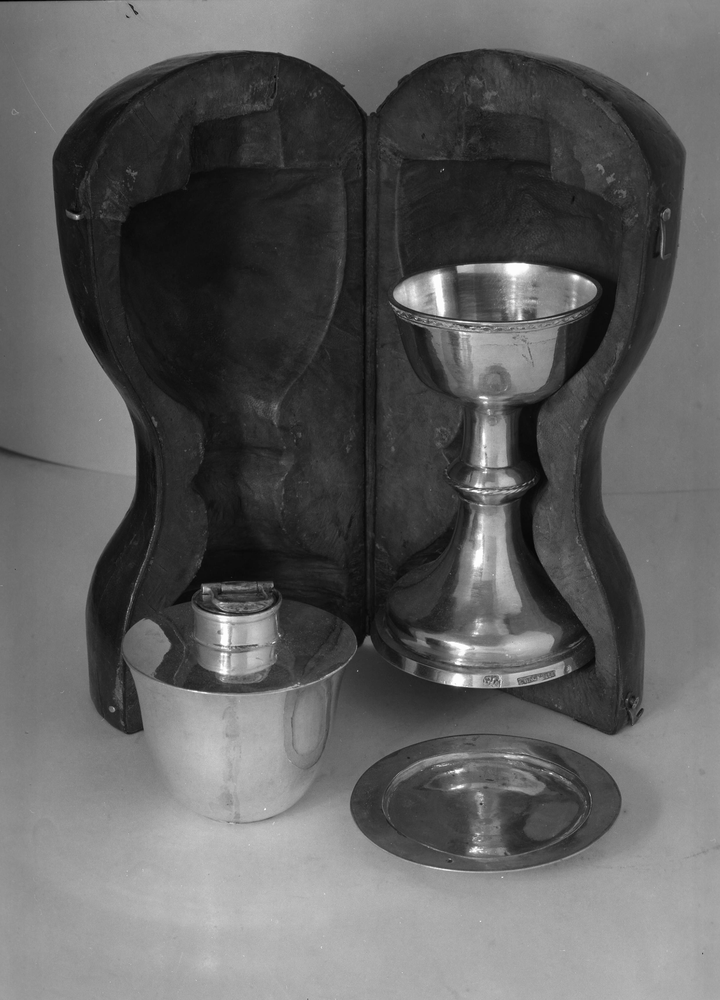 Sockenbudstyg med fodral av svarvat trä. Omkring 1800.