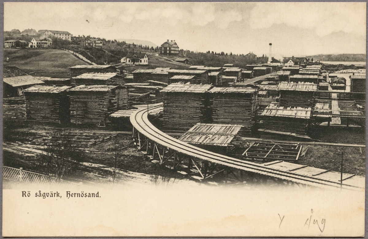 Titel: Vy över brädgård vid sågverk.