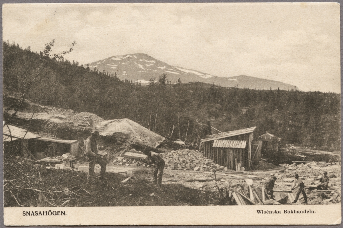 Titel: Stenbrytning i Handöl med fjällmassivet Snasahögarna i bakgrunden.