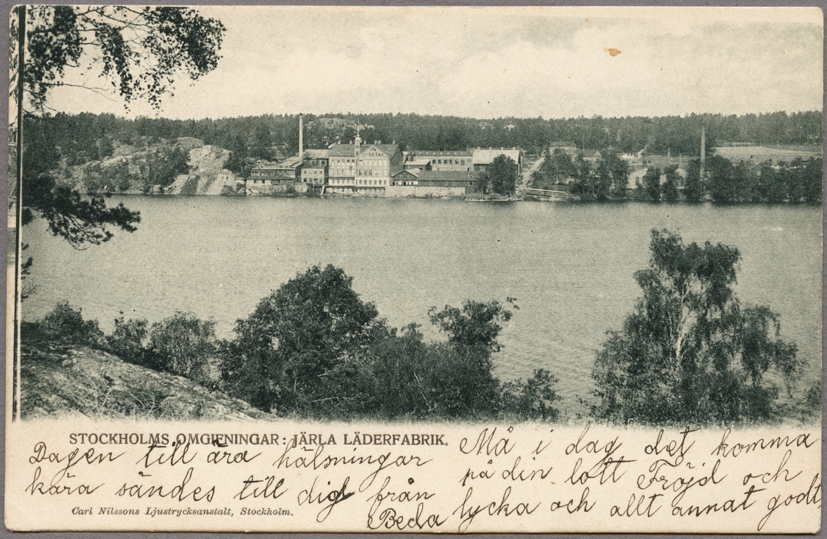 Titel: Vy över Järlasjön med Järla läderfabrik i bakgrunden.