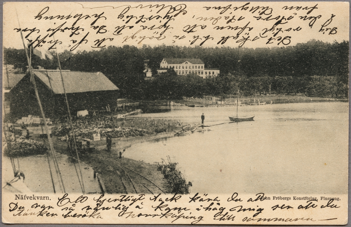 Titel: Vy över hamnen i Nävekvarn med herrgården i bakgrunden. Unionsflaggan är hissad. Arbetare vid en vagn på järnvägsspåret som leder till bruket.