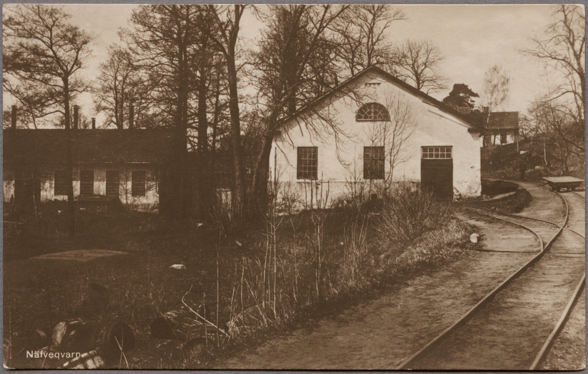 Titel: Nävekvarn med järnvägsspåret mellan hamnen och bruket.