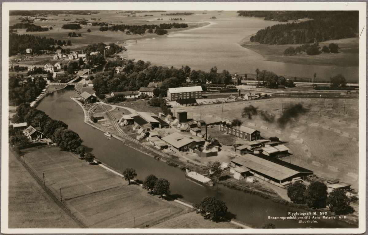 Titel: Flygfoto över sågverk i Norsholm vid Göta kanal.