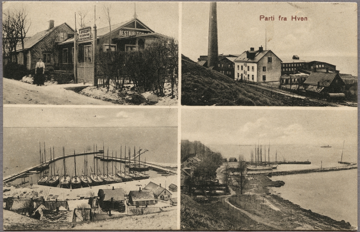 Flerbildskort med motiv från ön Ven. P. Arvidssons Restauration och Matservering, hamn och tegelbruk.
