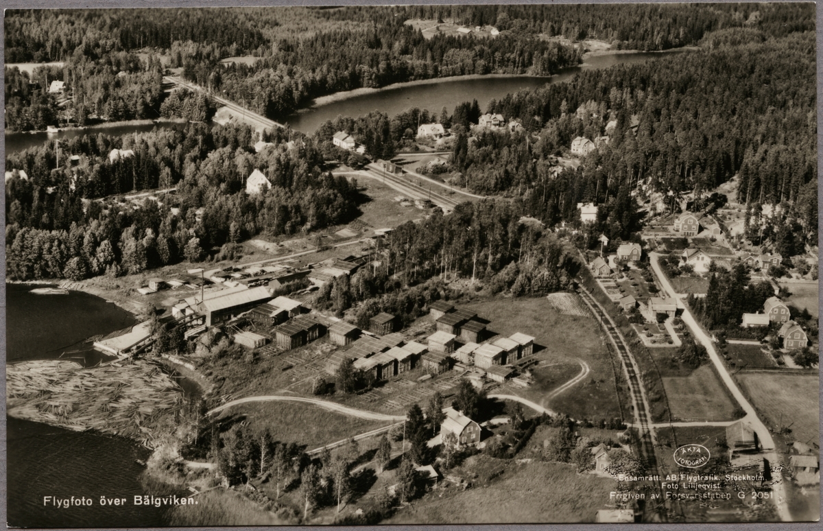 Flygfoto över sågverk och stad vid sjön Hjälmaren.