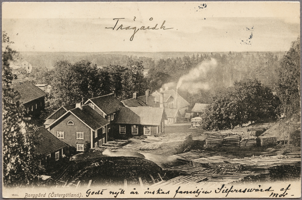 Titel: Vy över lagerplats för timmer.