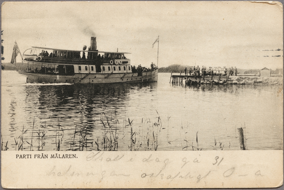 Titel: Ångbåt lägger till vid brygga i Mälaren.