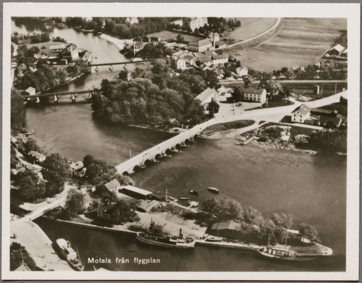 Titel: Flygfoto över Motala med broarna över Motala ström och Göta Kanal.